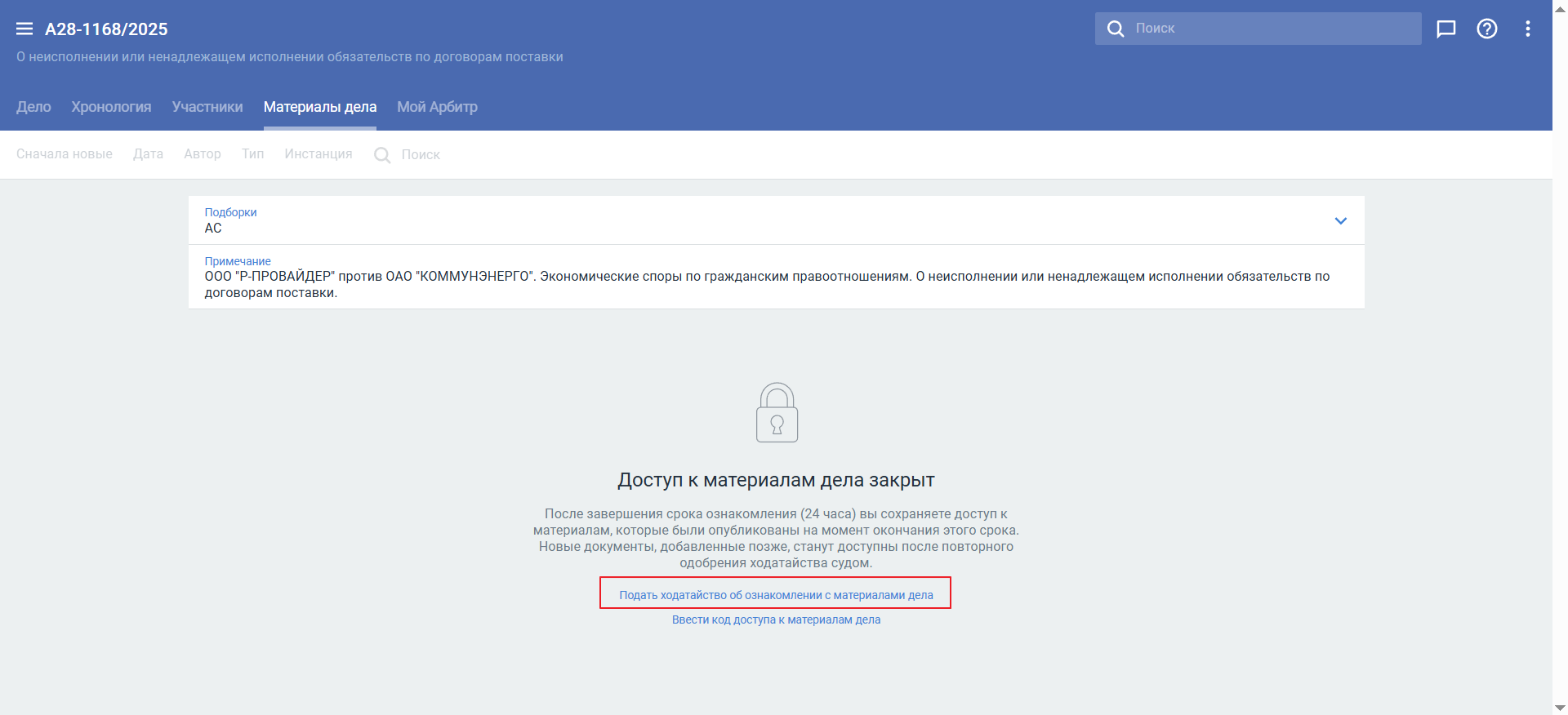 На вкладке Материалы дела отображается кнопка Подать ходатайство об ознакомлении с материалами дела.