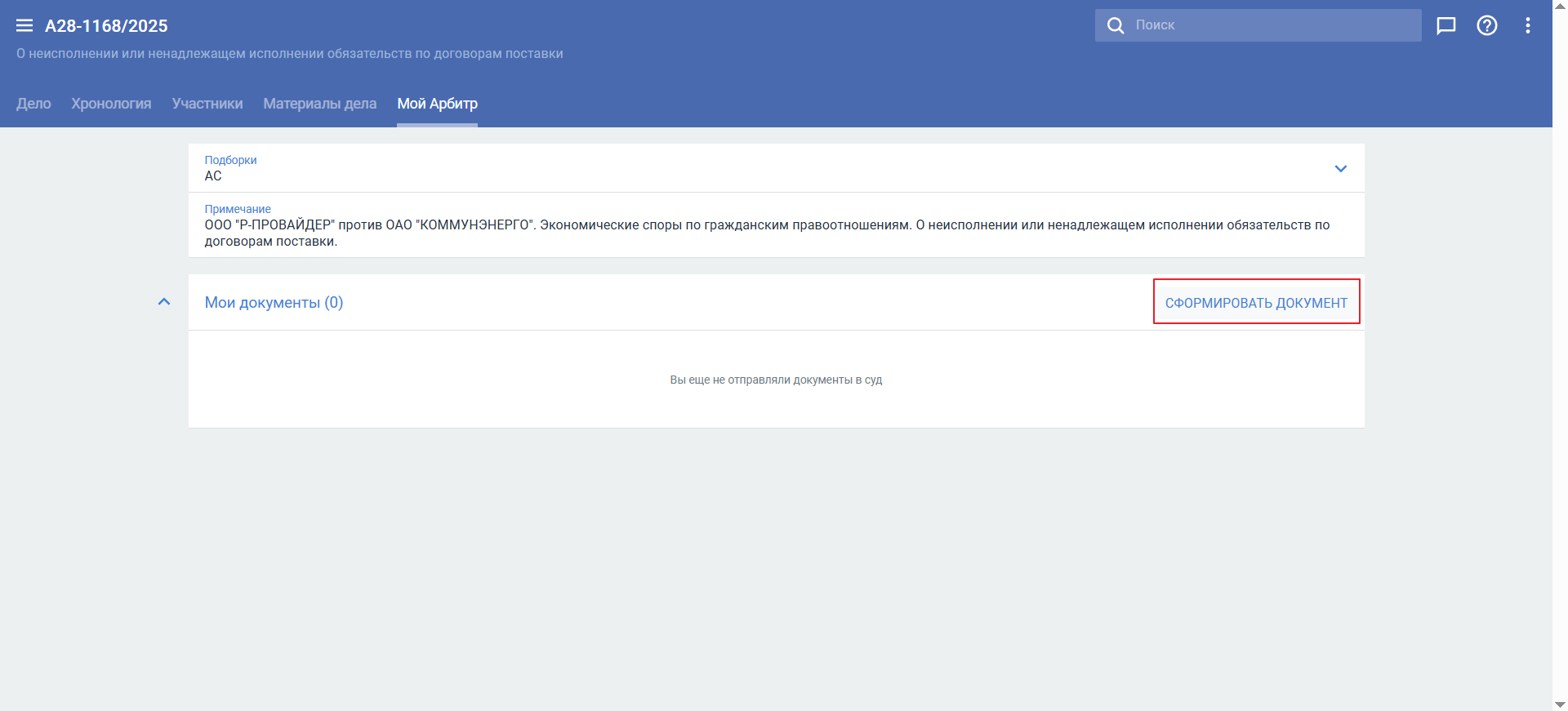 На вкладке Мой Арбитр отображается кнопка Сформировать документ. После нажатия кнопки откроется такая же форма подачи обращения, как и при действиях на вкладке Материалы дела.
